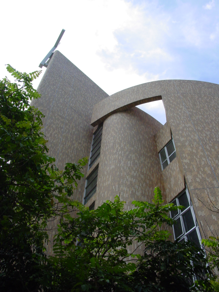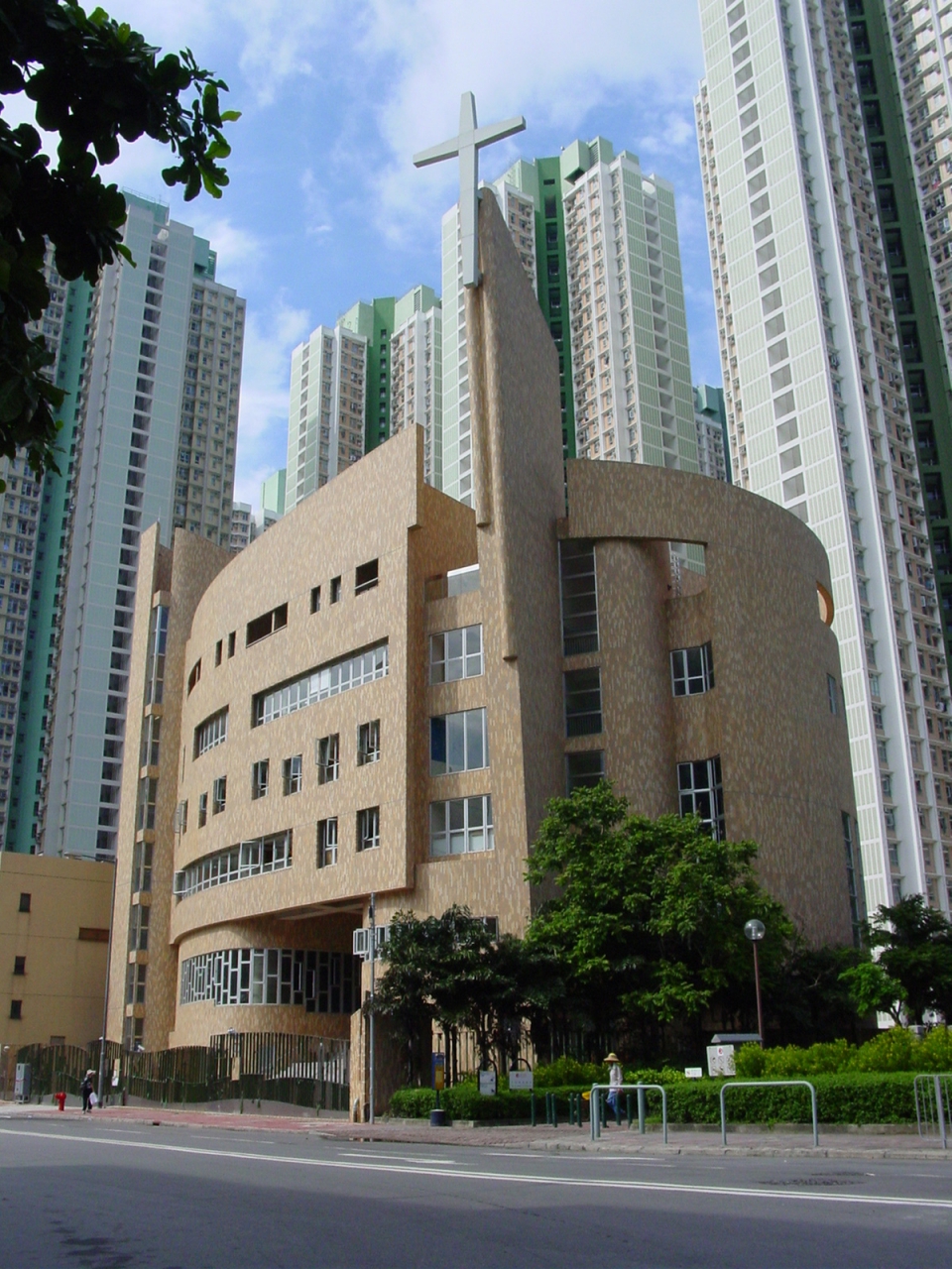 The external wall of this 5 storey church building is cladded with Brown external wall tiles. The building is circular in shape, with The main chapel at the 2/F, and the kindergarten at the 3/F and 4/F. An aluminum cladded crucifix anchored at the highest point.